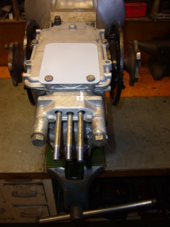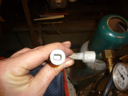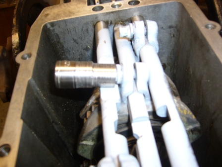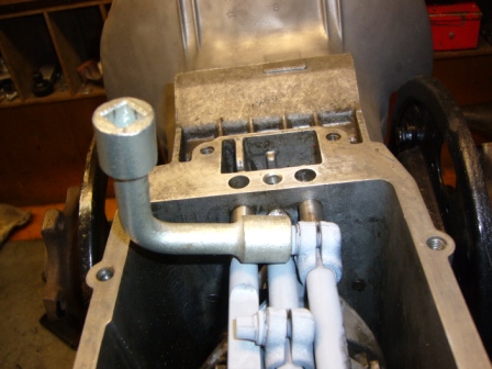 Working on the gearbox. The rod clampbolts on the selector have a special model. To unscrew them, you need a special tool. This is a very expensive tool, so i made a cheap tool from a lever of a valve of the gasbottle. A little welding and it is possible to untight and tight the bolt to its torque with a torquewrench.