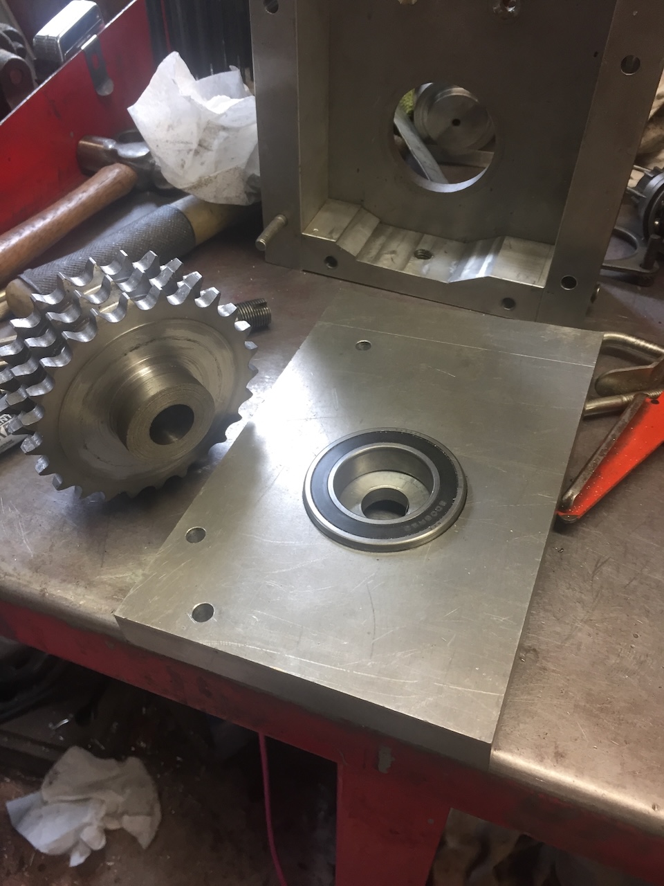 Managed to recover from my mistake, everything now lines up and the shaft turns all ok with the bearing clamped-up tightly. Bearing cover needs to be made tidier. Attachment: