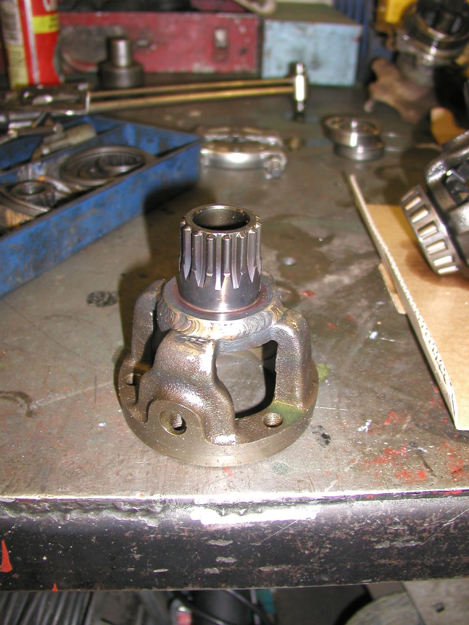 Some pics, The output shaft is a longer new item, Deeper new bearing carrier. Spline welded to diff carrier. Attachment: