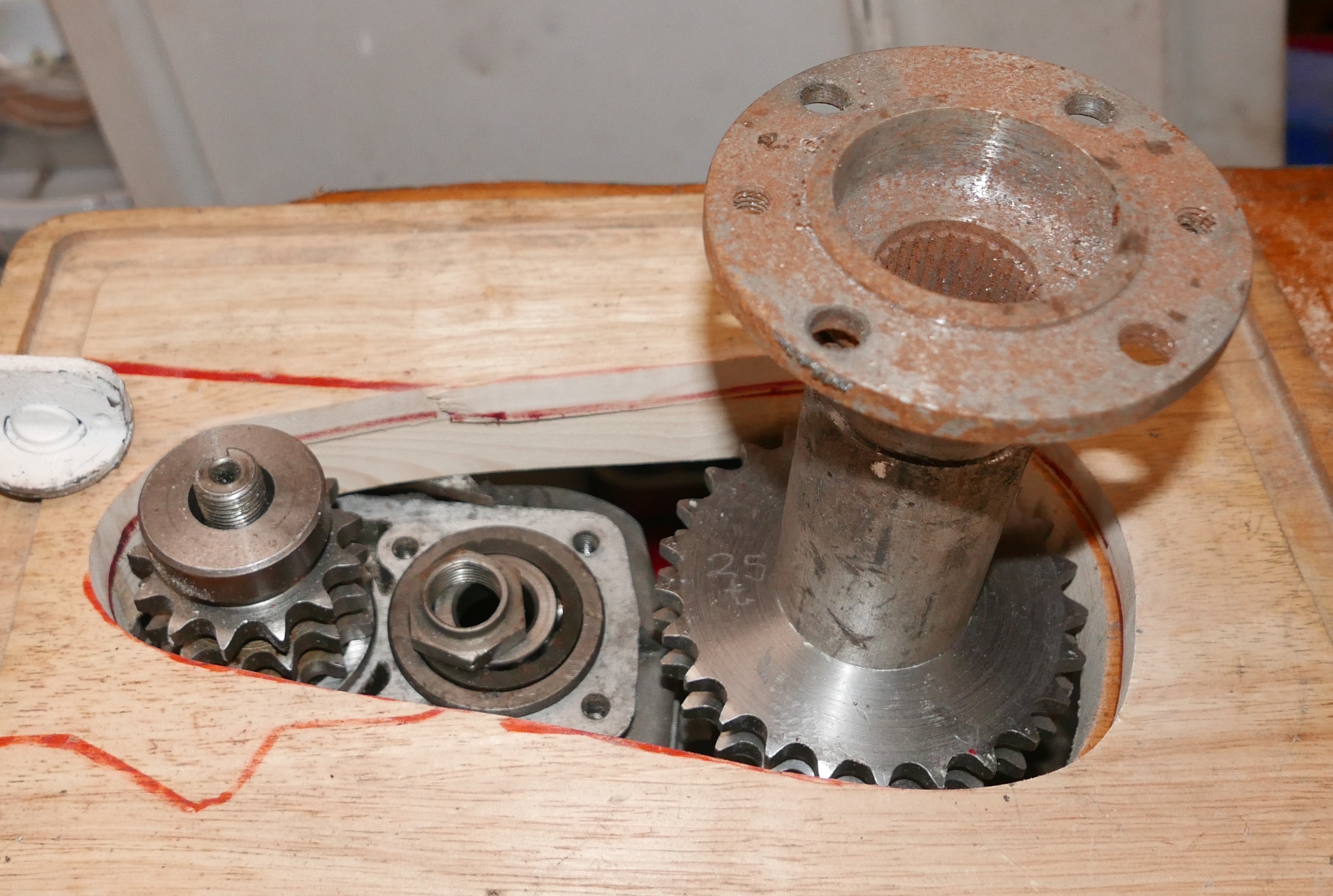 Using industrial duplex chain, 08B size, Looked at automotive “Silent chain” but can’t get the ratios, and new parts are very expensive. Will have a step down ratio (13:25) and dog clutch at the gearbox end, Rear cut down Diff / prop always connected. Waiting on some “alu” plate at the moment. Will post some more pics….. Cheers Peter