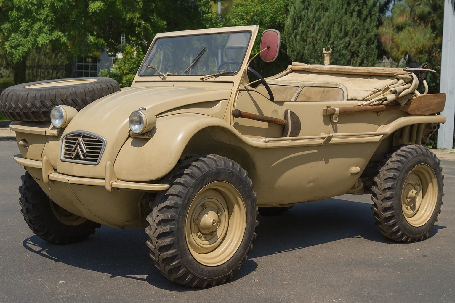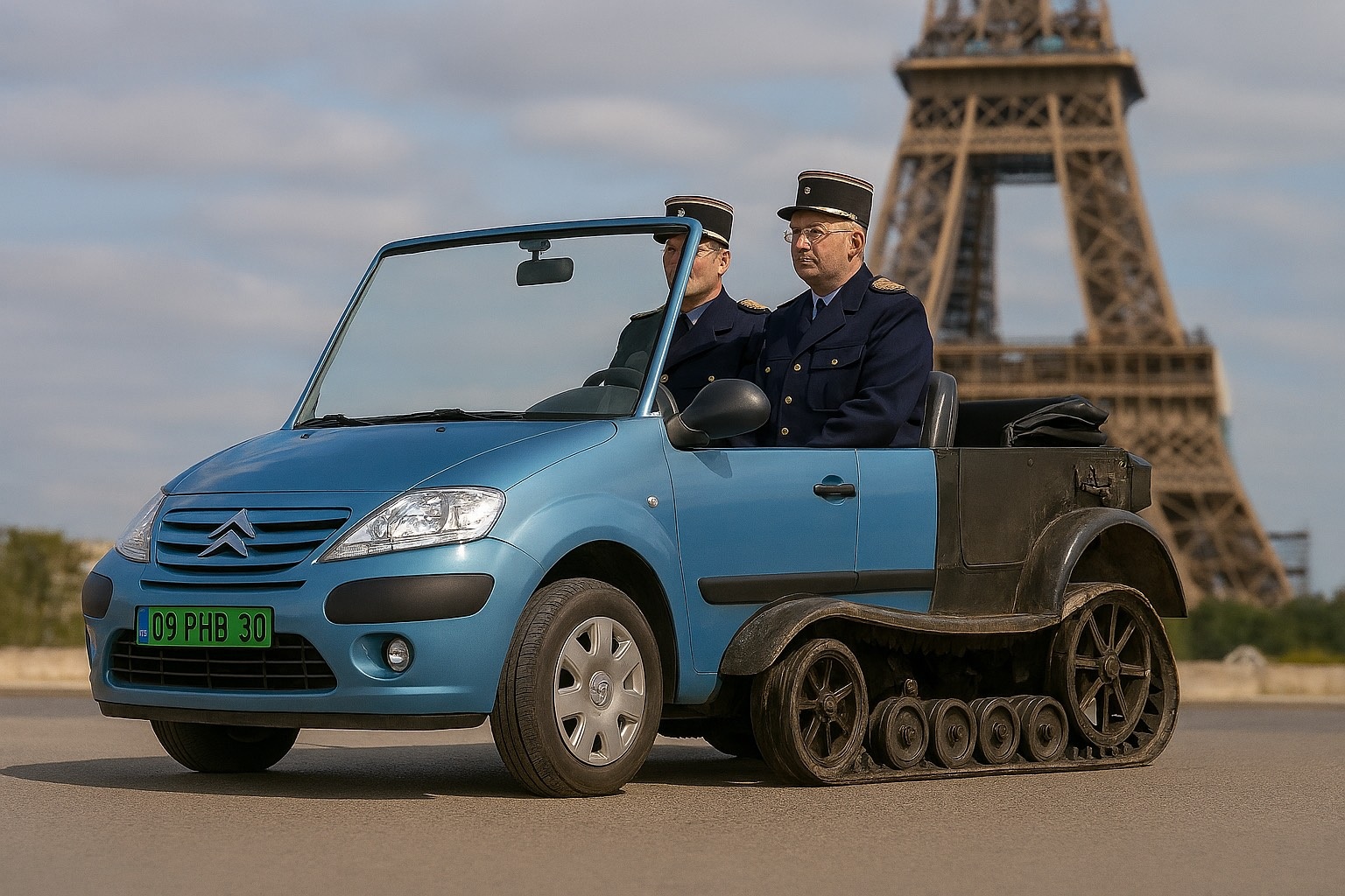 And again some stupid foto made with AI. Factory with models with 3 wheels, strange things mounted on the rear. The blue belgian style model has ripples or louvres in the back lid....