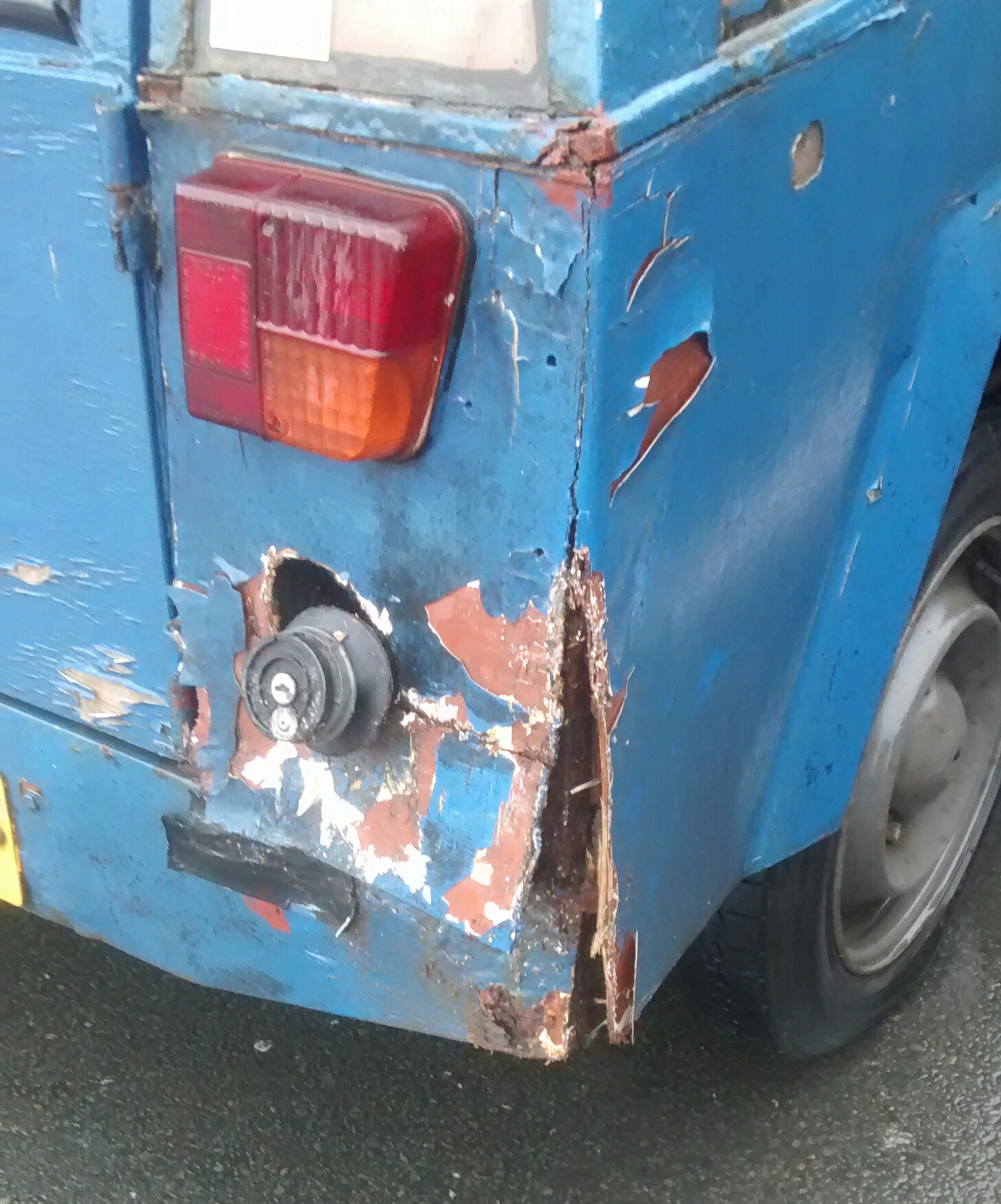 Fortunately, its repairable. The wooden skin on the back was due for replacement anyway. The metal frame underneath has seen better days and the knock did break it. It would have been better, if the MOT wasn't due in May.