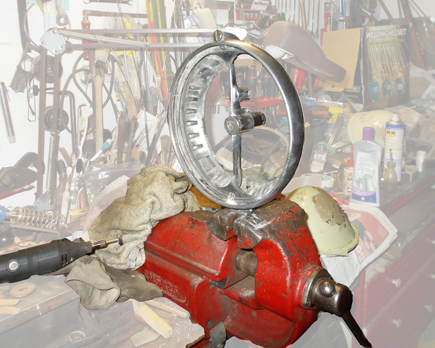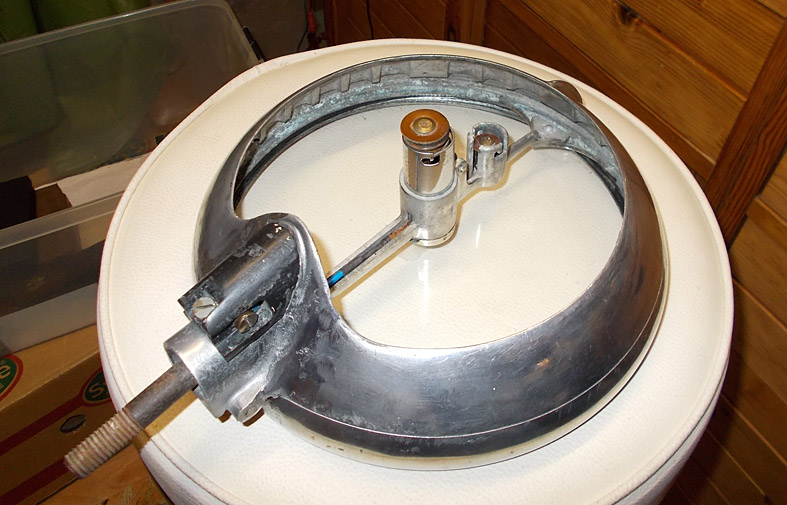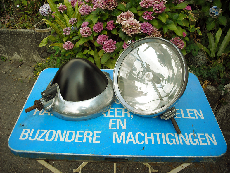 ther job, repairing the broken headlamps. I bought them for 5 euros from a farmer in france who had them on his tractor. One had a broken aluminum frame that was welded by a friend. But it took a lot of filing an grinding to make the edges smooth again so the reflectors will fit in again. Also the internal cables were broken that i had to repair. The worst one is ready now to receive the reflector. On the second one the hinge pin was half broken so the lamp didn't close very well. I drilled it out and now i have to make some new pins on the lathe. The reflectors were both dented, i tried to remove a much of the dents as possible without damaging he reflective side. They are waiting to be repainted from the back. Not even mentioning the cleaning and polishing of the oxydized aluminum parts.