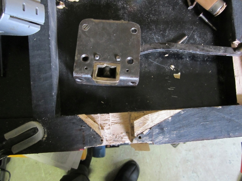 I am woodworking again on the 5HP door. The problem it's a bit to large and i did not have the original 5hp doorlock. In the box with parts that came with the dismantles car there was a lock also Citroen but i think it was from an older model. As the car was transformed to 2 doors i wondered why there was only 1 lock. SO i had to do with what i had. I cut the door to fit the other lock in. When i was in the garage a had taken almost all from that parts box and heard something sliding in it. It turned out the box had a double bottom and the right lock was in there with latch. I did want to put that in but now there was a part of wood missing that should take the screws for the other lock. So now i am glueing in parts of wood to fill it back in.... Hope i get it ready before the woodworms come in.