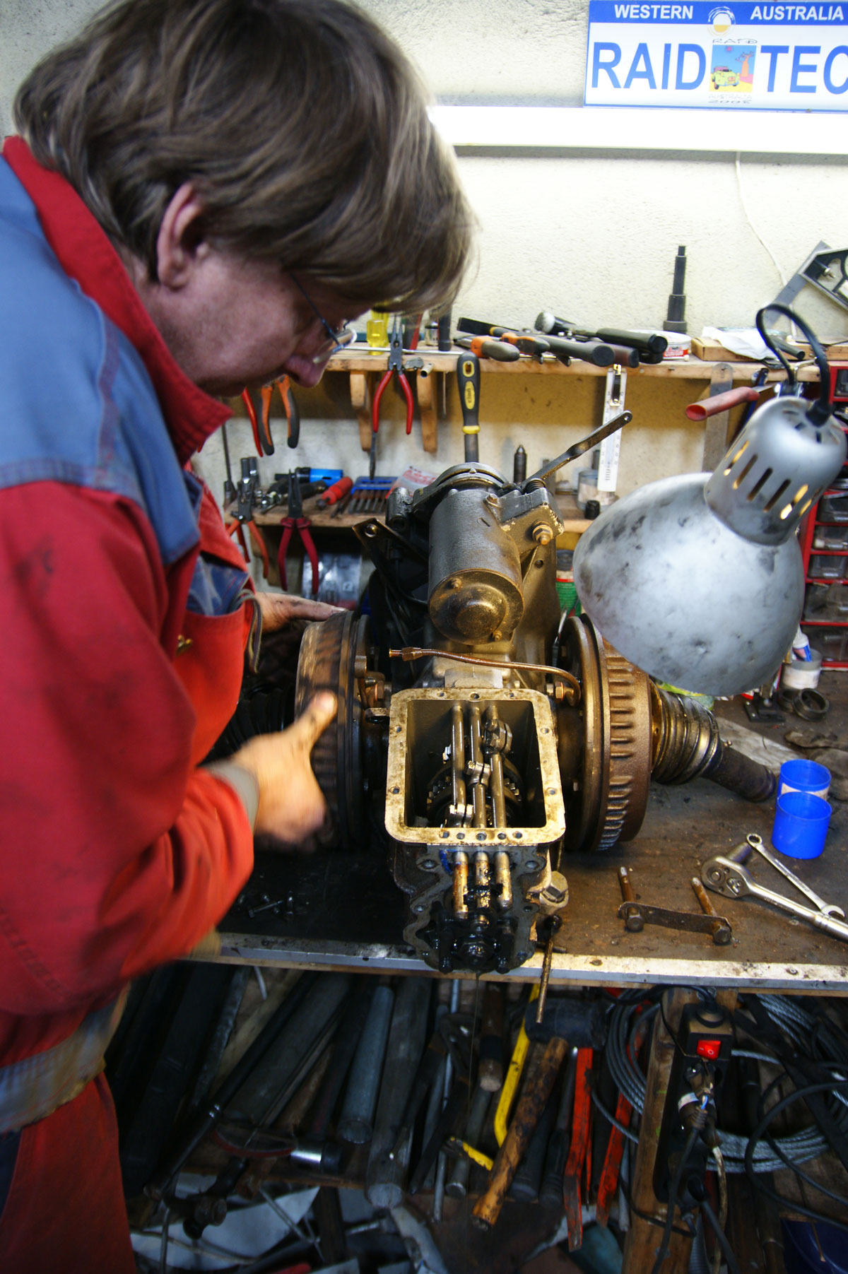 Coincidence is a funny thing. Hetty's gearbox broke at the year's biggest gathering of 2cvs. I get recovered to the workshop of a gearbox expert and, camped not 200 yeards down the road, are my neighbours Bob and Carol Brotherhood who live around the corner from mt parents house in Sussex. Weird. Bob came along and we made short work of removing the engine and gearbox in one lump with help from Peter's awesome engine hoist.    I was amused at how removing the weight altered the suspension of the van.  Peter again opened up the 'box and removed the rear cover.    Watching Peter dismantle a gearbox is a sight to behold, the deftness with which he handles all the components is astonishing. I watched eagerly and Peter gave me a running post mortem of what he found. The goo around the end cover showed that the 'bos has been opened in the past. Hetty has, at some point, had the wrong first and reverse gear components fitted. Older cars have a slightly different setup, but the components which create the first and reverse gears are from a later D*lly box and because of this, there was substancial play in those components. Having got over my misunderstanding that gearboxes are full of fairies and magic I also began to understand my second misunderstanding. 'Gears' are not a physical thing. There are no neatly arranged cogs for first, second, third, fourth and reverse. Its all a matter of semantics. When we change 'gear' a number components in the box are moved to create a new ratio. In a effect, what we call a 'gear' is actually a ratio created by the interaction of different components. Peter continued his explorations until he found the cause of the issue.     What you're looking at is an inner drive shaft. A sheared inner drive shaft to be precise. This shaft (correct me if I'm wrong Viking) is attached to the differential. Because this sheared, it possibly saved the entire box. My initial concern was that my driving style or lack of maintenance had caused the issue, but Peter assured me that unless I'd been 'Kangarooing' (I haven't) there was no way that I could have caused this, it was just metal fatigue. Interestingly, in all his time as a Citroën mechanic and in his years at Viking, Peter said he'd never ever seen this failure on a gearbox. Wahay, I'm unique!