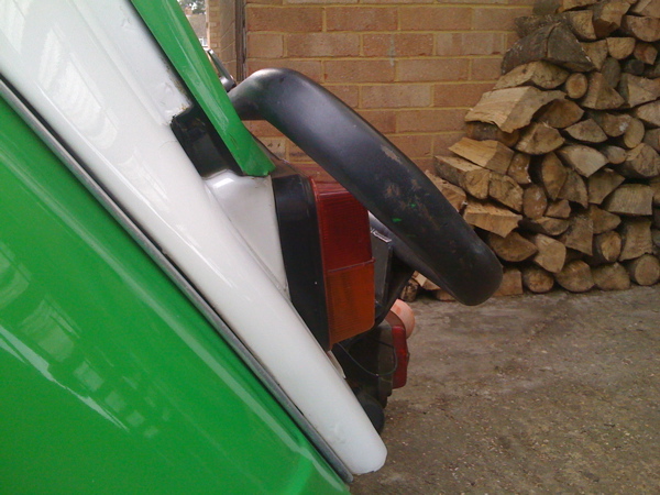 The adv bumper is bent into the bootlid which is jammed against the body. In a kinda cool way, the adv bar has sliced the boot handle in half! However, because I can't get the boot open I can't see inside and FJ have asked me to leave her alone until their inspector's seen it.