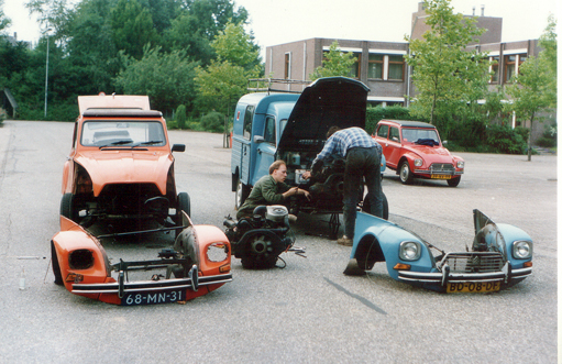 My cars are never secondhand, mostly sixth or more Rob you loosened to many screws on the Dyane. There is a trick but you have to be with two persons. After disconnecting several bits you can take the complete nose off. Here you can see Geo and me doing a transplant on a acadyane.