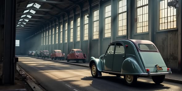 And again some stupid foto made with AI. Factory with models with 3 wheels, strange things mounted on the rear. The blue belgian style model has ripples or louvres in the back lid....