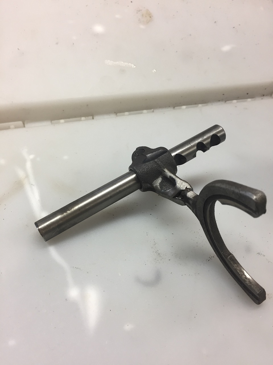 Try out for the additional shaft, with dog selector. Re-using a top shaft and the third gear dog selector parts. Ignore the large hole in the casing, this was an attempt to use gears like a Mehari 4x4. Attachment: