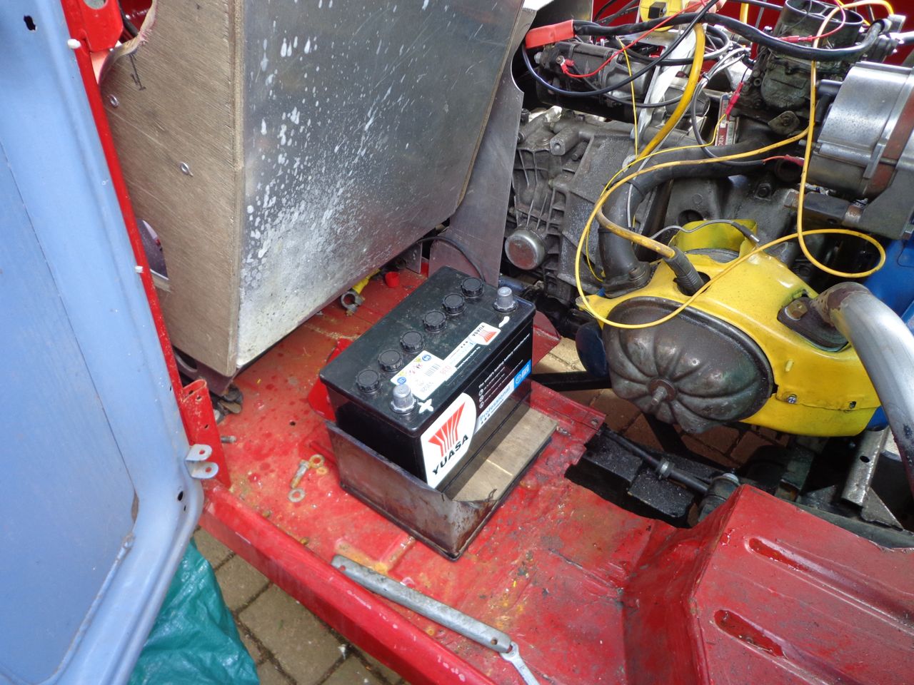 Battery Tray behind drivers seat.
