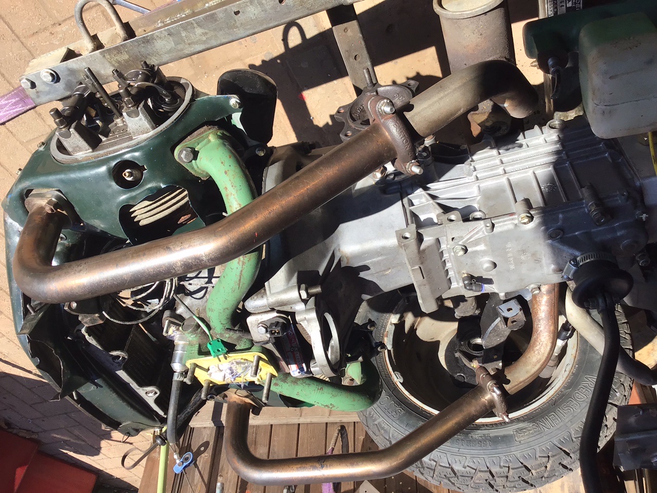 Engine and “clean” gearbox in place minus lots if bits, the hardest to fit is the clutch cable, which is in the post. Attachment: