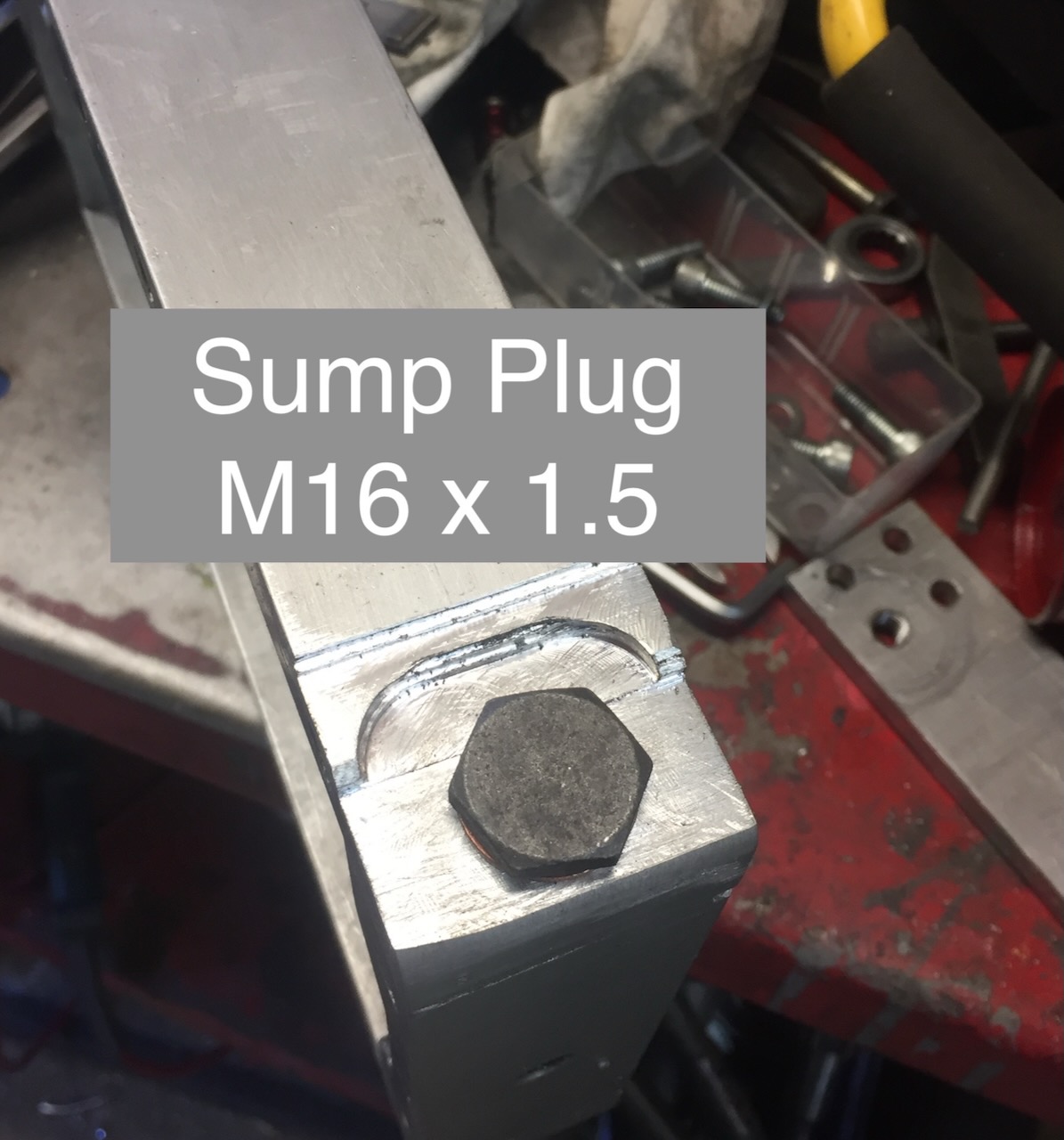 Today drilled and tapped M16 x 1.5 and fitted a sump drain plug..