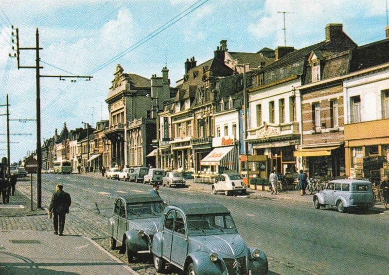 Some 2cvs parked in this town. The one at the right has two extra windows in the rear lid.
