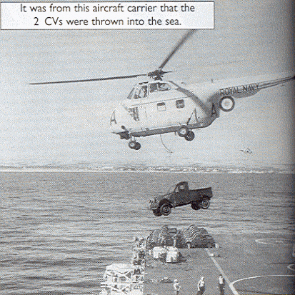 In reply to the caption on the RN pick-ups. It's a well known fact that almost all of the 2cv pick-ups were pushed overboard, into the Indian Ocean and replaced by Land Rovers(the RN had taken possession of helicopters that could lift Landies).