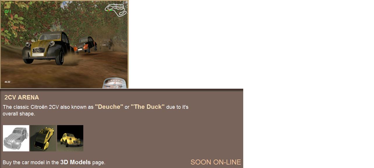 Soon we'll all be able to drive Virtual Deuches! Perfect for those winter days when the weather's too foul for our dear little Duckies, or those times when the engines in bits all over the floor etc. http://www.3dnemo.com/06_games.html (scroll to the bottom of the page to see what the heck I'm on about).
