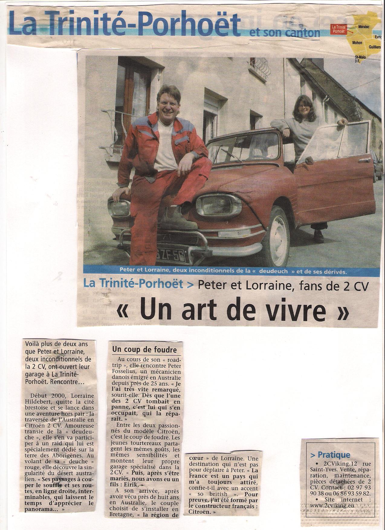 We are world famous in La Trinité Porhoët (again). It seams that the French are fascinated with stories from the past, I guess sheer nostalgia, in this case that a 2CV Garage has opened servicing and repairing 2cv’s only. Our region (Bretagne) is considered a bit remote in many French peoples mind even not very French either. Anyway it is good for us to see some free publicity in the regional newspaper.