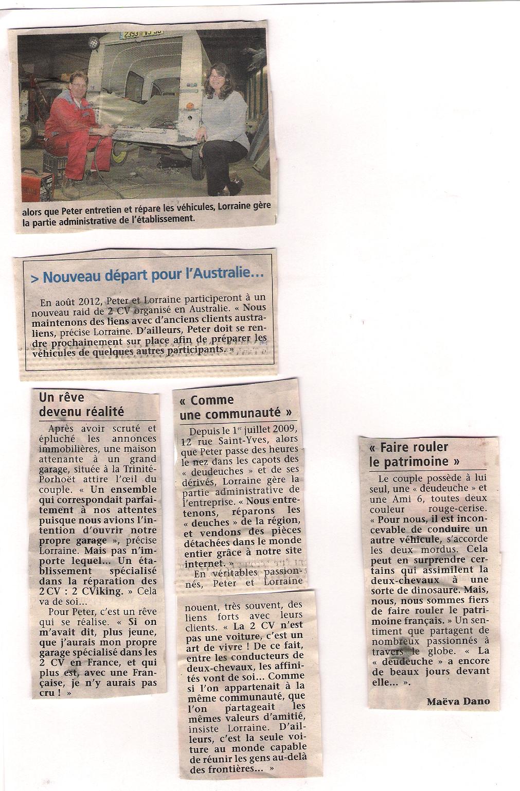 Yes, the first and second article lifted the interest in our business. Many smaller repair works around Brittany began to order parts from us + some gear boxes came to us for overhauling. Without these articles people wouldn't find out that we are around. Even Citroen dealerships around Brittany is buying parts + sending A model owners our way. They don't carry any stock + have no idea how to repair such old cars. 2CV clubs around Britttany is also reading those newspapers spreading the news to 2cv owners. I guess the newspapers here are keen to report any new businesses opening as most things are stagnated. All small villages are going backwards draining people and businesses, so new business is interesting + it is a story about French cars from the past and so on like that. I'm sure this 3rd article will lift the interest even further, which is very good for us. Been here for 3 years now, it has been tuff coming from Australia and starting with a status lower than whale shit but we are getting there. :mrgreen:
