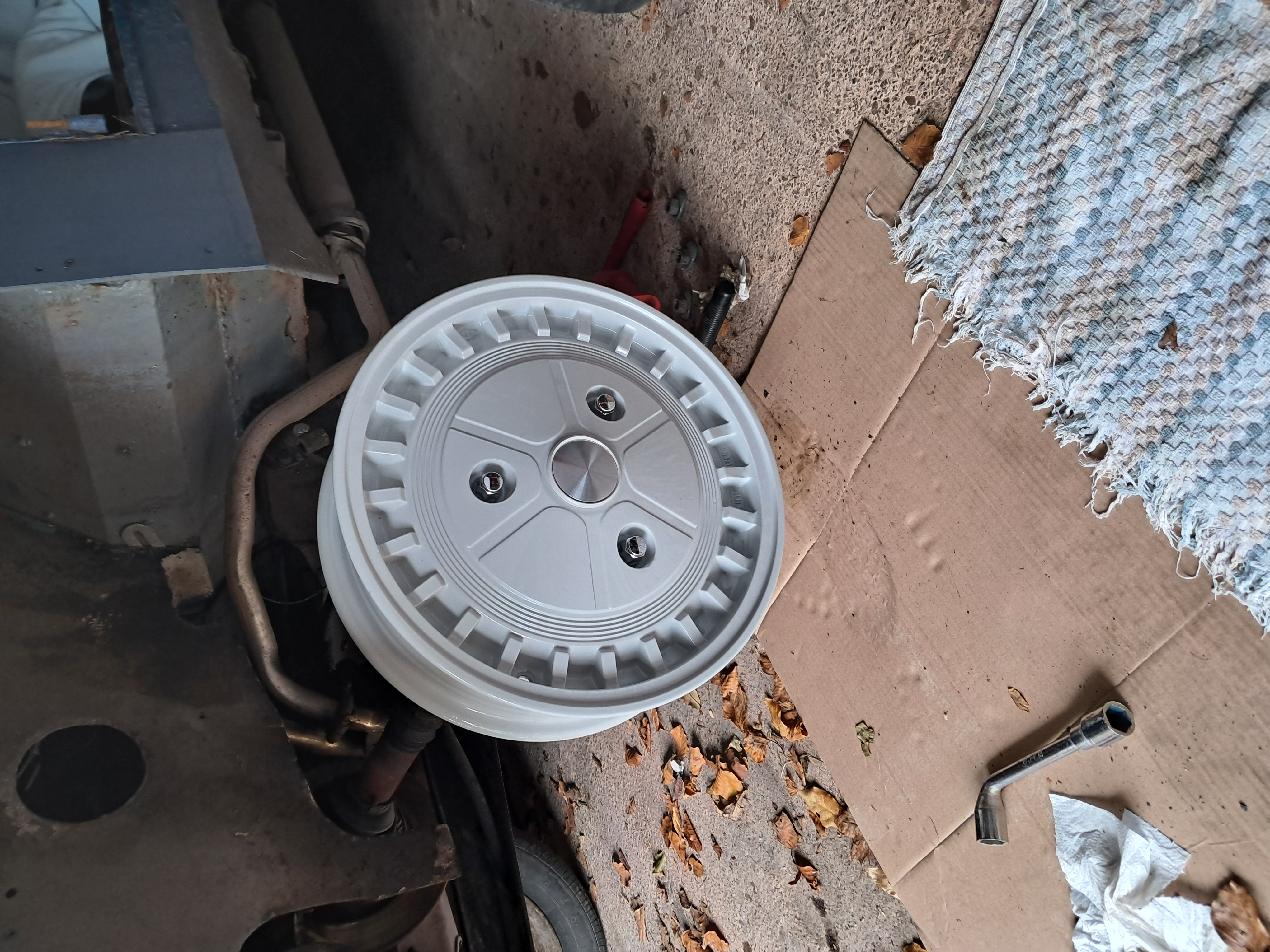 Some more progress  The spacer needs the rough edges cleaned back, but this is what it looks like in place. The stud holes have been drilled out since this image  I will look into getting a pair of tyres fitted this week. 145/65 R15