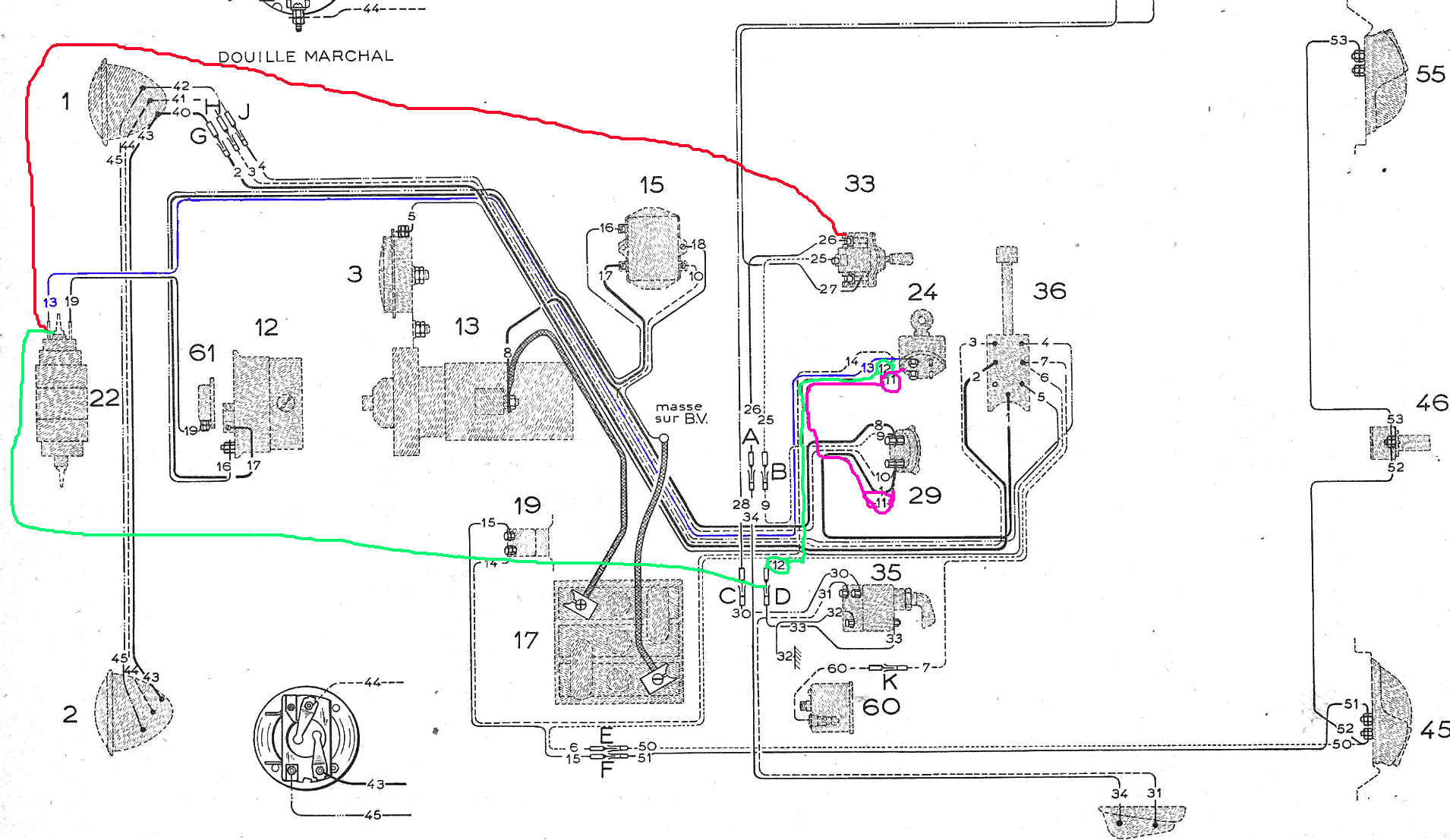 In the meantime , i have installed a new cable ( green ) duplicating cable 13 : It comes from cable 12 also coming from the ignition switch and goes to the coil .