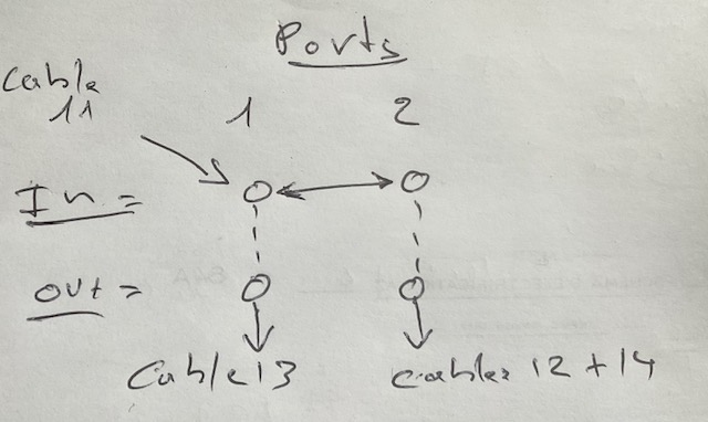 I connected cable 11 to Port 1 "in " ....................cable 13 to Port 1 " out " ....................cables 12 and 14 to Port 2 "out" .....................Port 1 "in " to Port 2"in"