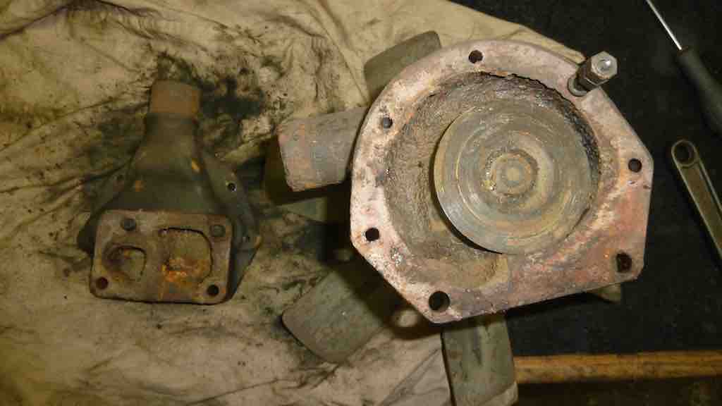 Then I progressed to the water pump which I thought was going to be totally rusted out. But after wire wheeling and scraping the guts out both units looked to be in good shape. The propeller is in perfect condition as are the bearings and seals. So more cleaning and paint work and greasing and rebuilding. Attachment:
