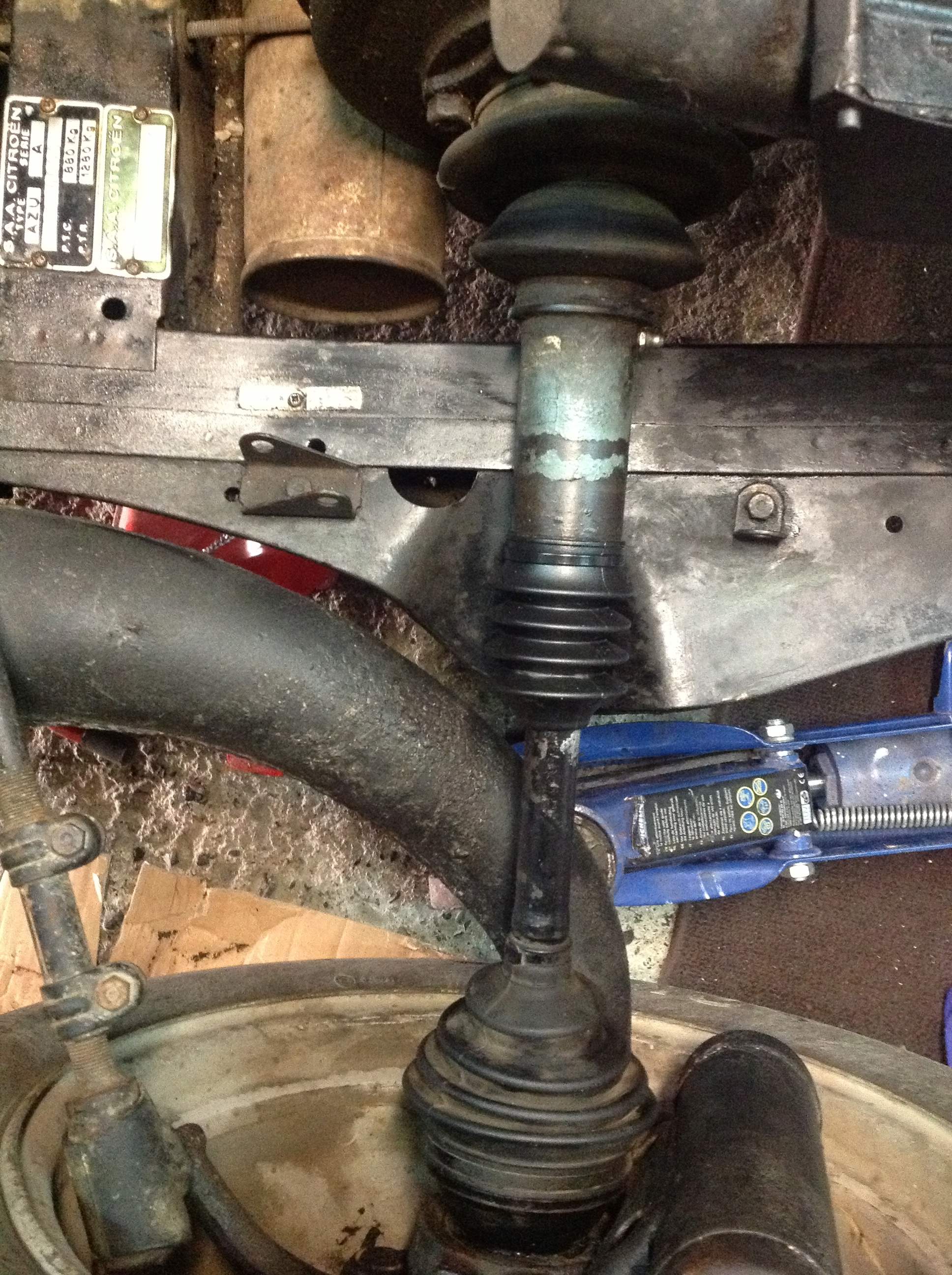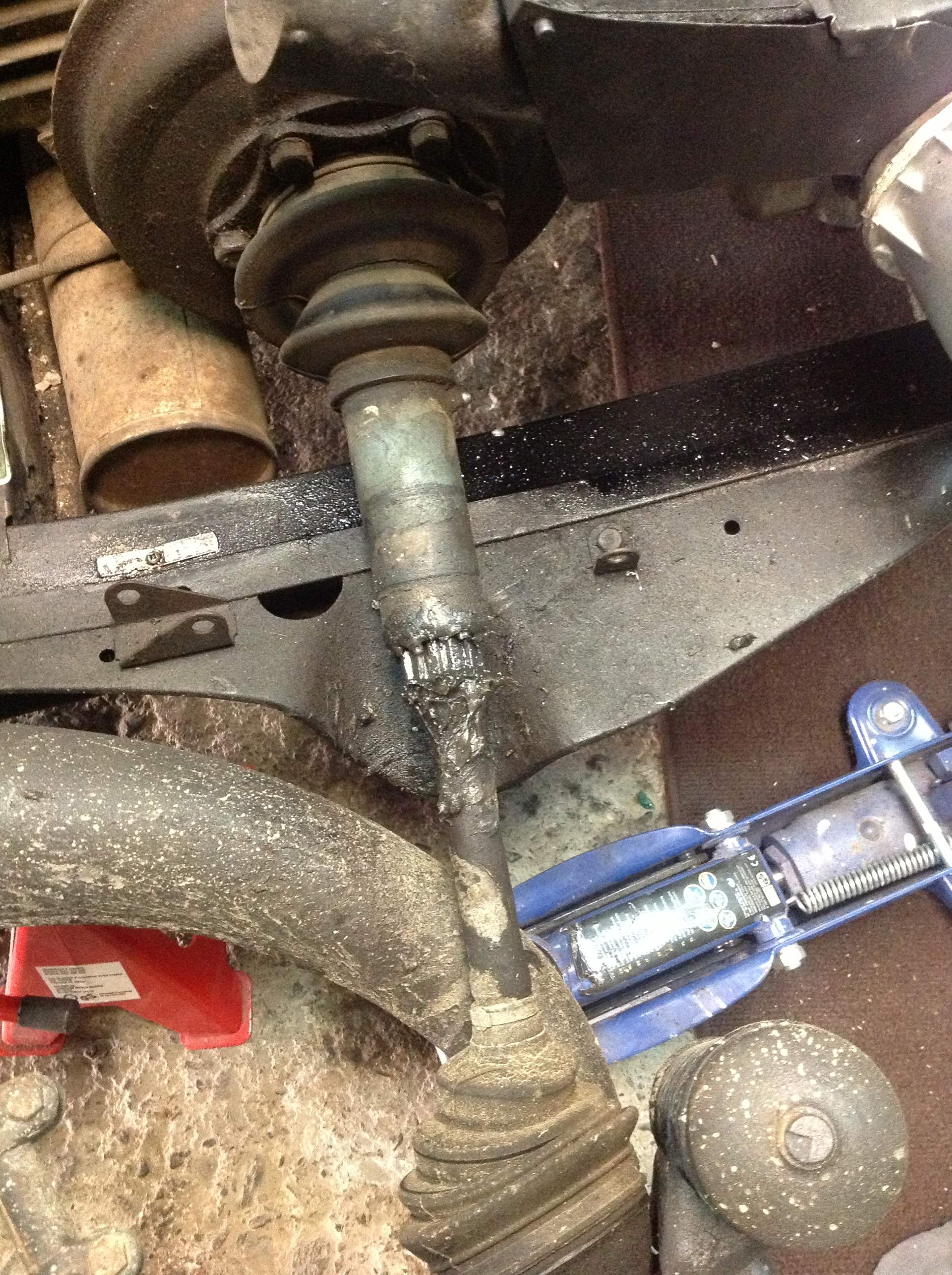 Is that madvice from the 'restoration' book? The usual method is to jack the chassis high enough for the suspension arm to be on 'full droop', turn the wheels towards the side on which you're working, then there should be no need for attacking the engine bolts. ken Tripyrenees wrote: It went to plan perfectly even the bit where I undid the engine bolts and scooted it over a little to get the end of the driveshaft out. All greased up (mistake number one, filled up the inner driveshaft and then found out the inner would not go in all the way... found grease nipple to release the pressure) All done  Can anyone tell me what the little bracket to the left of the driveshaft is for, this side is empty, the other side has two perished rubber bungs.