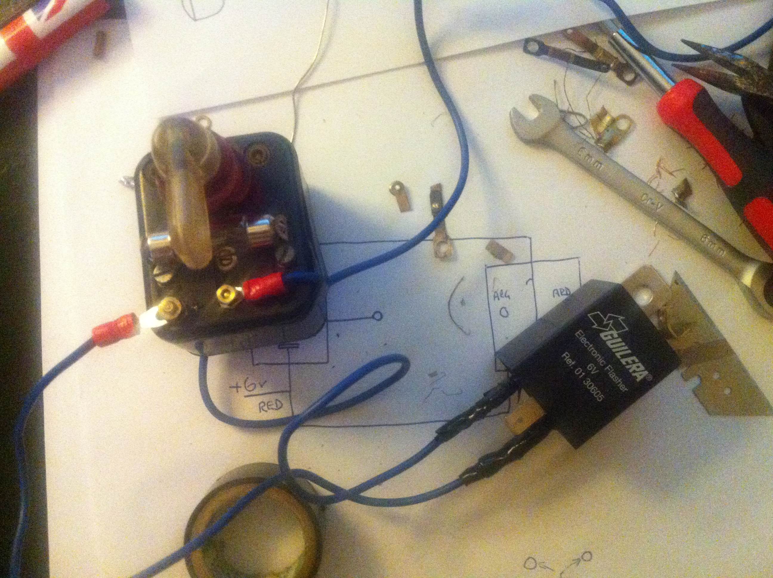 So I bought a cheap 6 volt flasher unit and stripped out the contents of the thermal switch and modified the connections inside to incorporate the new flasher unit but keeping the original switch so it looks and operates as it should (including the dash light flash).