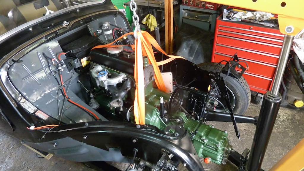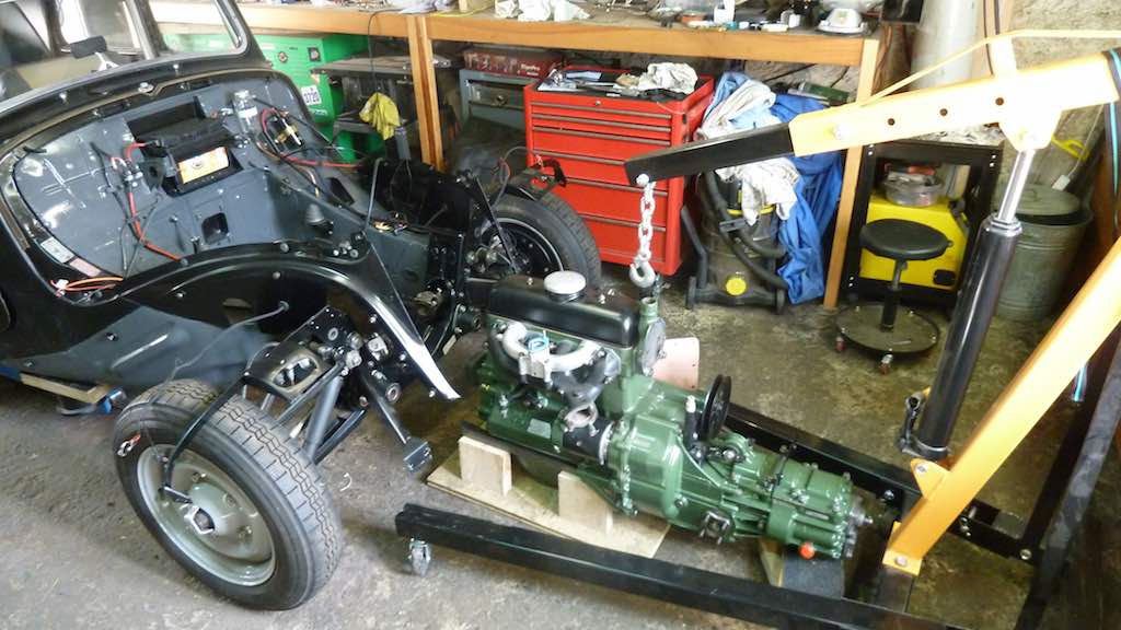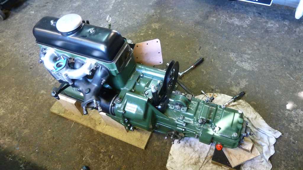 Just stopped for lunch (bloody juice, now 8 days) but about to start putting the engine back in the car - gearbox is attached