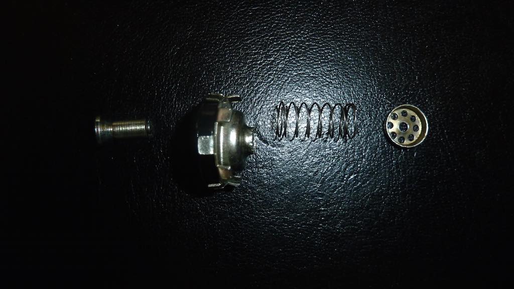 I went and bought an Eezibleed kit as the one we had seems to have disappeared  Put it on as the instructions (20PSI off my Dyane spare ) and the fluid rushes into the Master Cylinder. Went to the rear right brake drum, opened the bleed nipple expecting it to gush out (I have used this kit before on my son's mini) but just a slight trickle. This cannot be right. So off comes the NEW master cylinder and I open it up to compare to the old one. I did measure the plunger orifice too and the new one is 44mm long and the old one is 46mm so not sure if that could make any difference But when I opened up the new I had a few too many parts floating around in side. The little non return valve had unriveted itself and the spring and holed disk were just rattling in the chamber. Hence the pedal going solid and no liquid able to exit the master cylinder. Not too happy but I have my old (new replacement non return) part from the old Master Cylinder that I will put in now and try. Attachment: