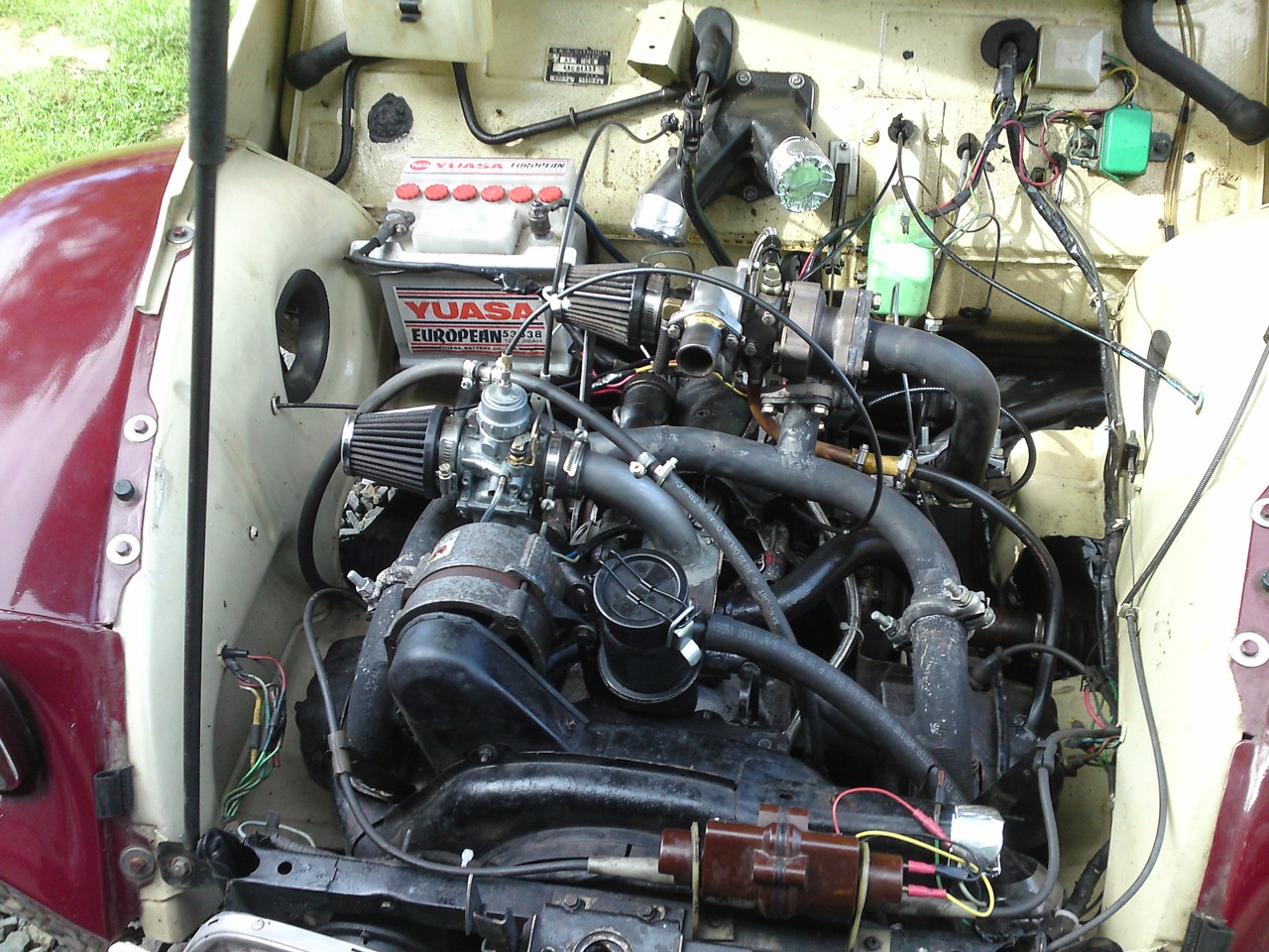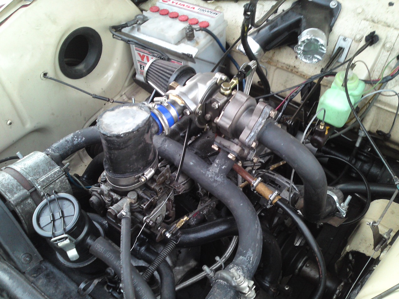 Tried all day to get turbo to pull more than 4000rpm - many different carbs- tried original Solex on suck but it would not run, tried my Amals from old Via engine - no way and a Bing carb of a BMW motorcycle - bit better. Even tried with no exhaust attached to the turbo - sorry village for the noise. Tried them all on the same piece of road. So time for plan B - stipped off everything that needed to come off and replaced original carb in normal place. Give the car a run and pulls like it used to (no surprise there) and linked the turbo to the inlet - so now blow though - as soon as boost comes on - around 2500rpm (I can now hear the turbo for the first time) the car dies - no surprise as fuel being pushed back (time for new electric petrol pump etc). Can have intercooler etc also - more fun.....