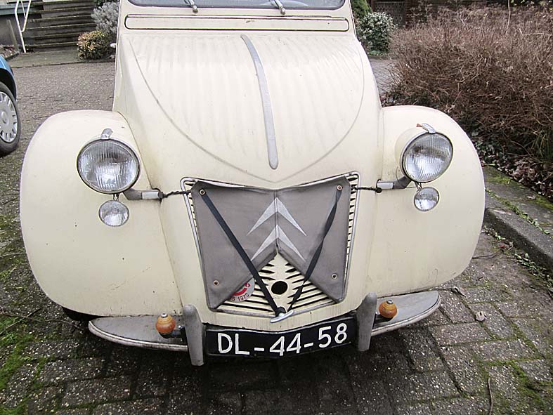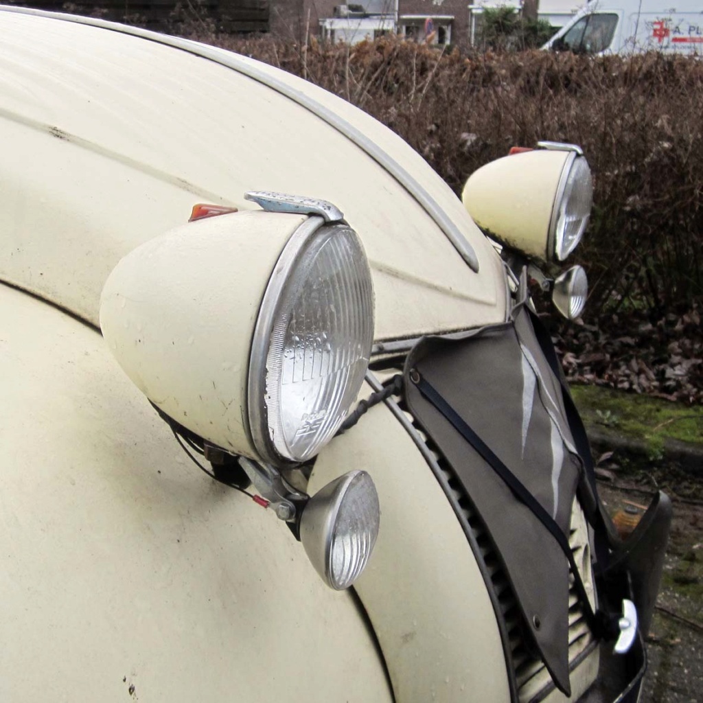 The city lights of the old 2cv are right misirable. Two tube bulbs behind the main reflectors. A slit in the bulb leaves a very small bit of light through. So i put 2 small bicycle lamps under the headlamps. Now the car is good visible.