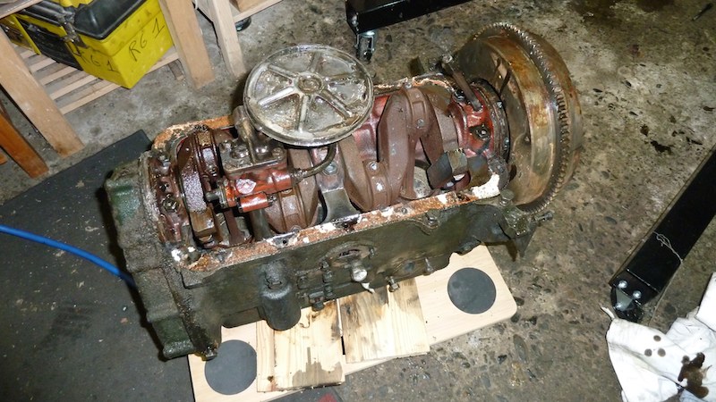 Right - it was time to see what the damage of 40 years plus has done to the engine specially after the water came out of the sump the other day. This engine is so heavy I cannot lift it, so had to make a small bracket and use the engine hoist to lift it and undo the bolts to the sump cover. Attachment: