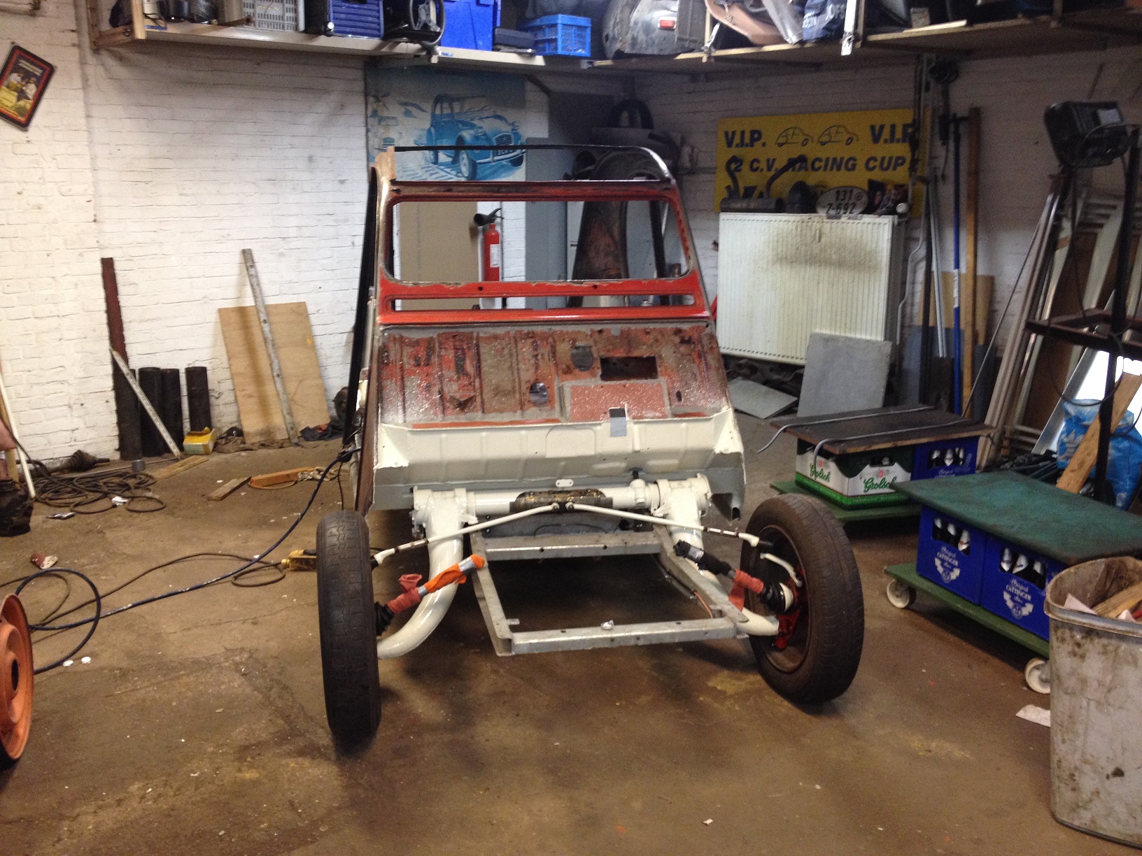 I did a lot of reading here but will now try to share some of my own fiddlings. Still trying to build my 2CV, should be ready before the summer. Since it already feels like summer it's time to hurry. The base was a butchered and rotten Citroën AZS from 1961. Complete underside and about 10" up had to be replaced, rear inner wings, window surround including cross beam under ventilation flap and the hinge. Chassis is one from 2CV shitty, and indeed it is a shitty chassis, parts are welded out of line and the whole chassis was twisted. This last bit we corrected with 2 heavy guys and some long poles  Front axle is from Acadyane, rear from Ami. Suspension is from Airbagit/A.I.M. industries/Chassis Tech, which is another supplier you wouldn't want to do business with. (complete untrustworthy bastards) Engine will be Acadyane or Visa for now, but since i'm dreaming about BMW power for about 15 years, i'll keep dreaming about it some more I made a lot of pictures but because of a lack of organisation, not all at hand at the moment (and i'm to lazy to resize and/or upload).