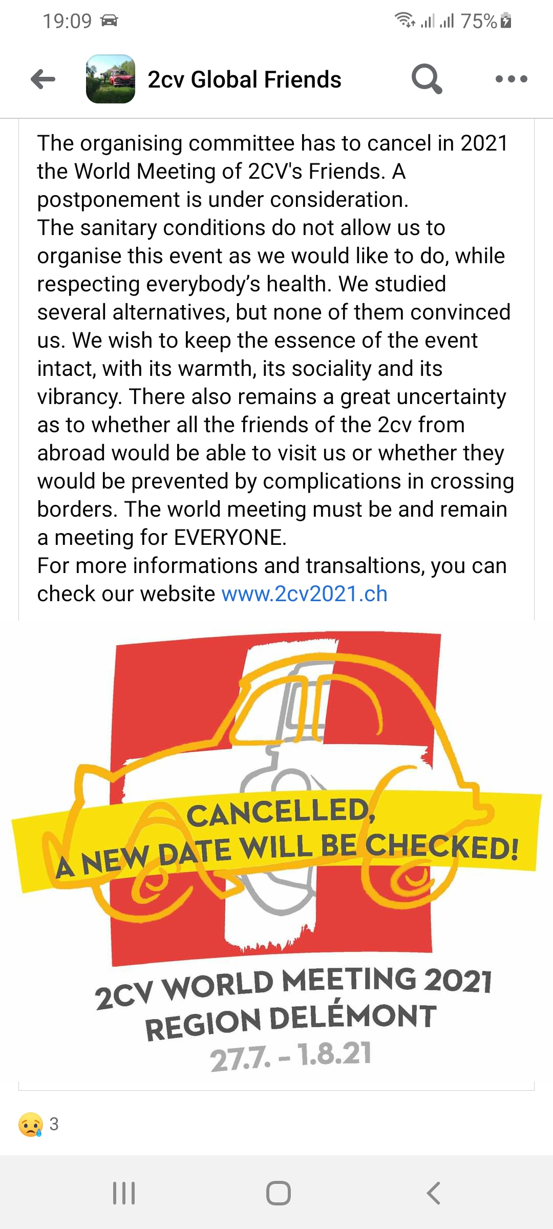 24th World Meeting in Switzerland cancelled. Postponment under consideration. More information here: https://www.2cv2021.ch/?lang=en