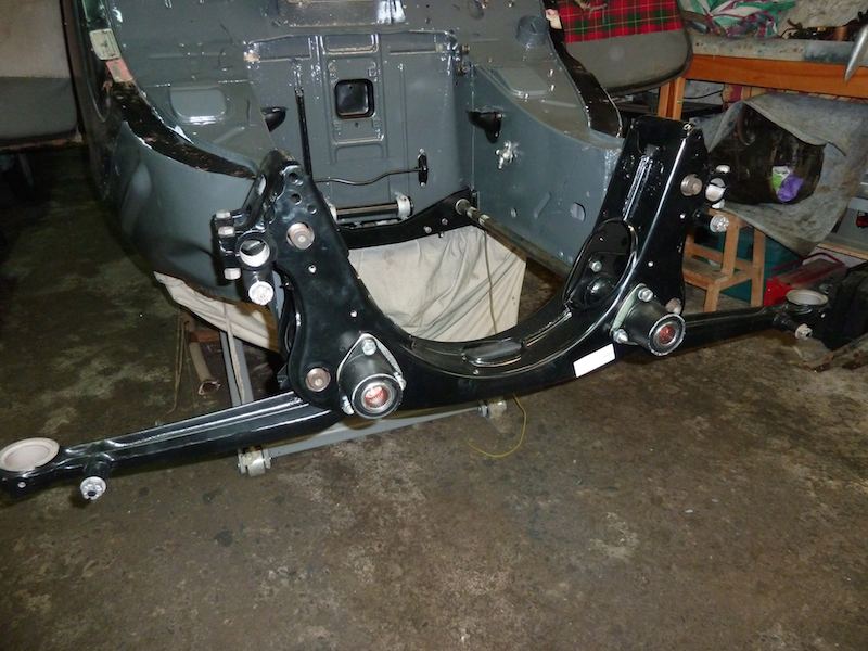 I offered up the the front suspension system and put in a torsion bar to see if it all fitted. It is starting to look like a car again....well ok, a skeleton of a car  I will read the section on installing the torsion bars tonight ready to get them in tomorrow. And then it is full on with the front suspension system and hubs. Attachment: