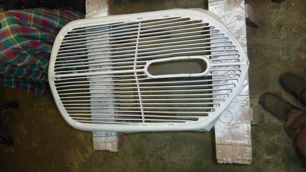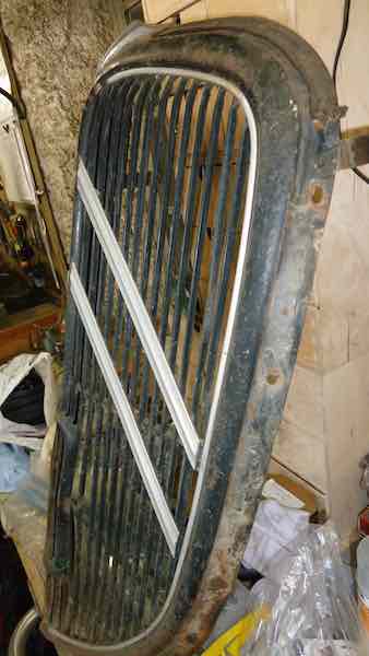 I sent the wife off to the sandblasters with my inner front wings, front grill, downpipe and long pipe from the exhaust. I wanted to see if I could use these sections of exhaust to save some money. All came back within the hour for a cost of €60. It would have taken me a couple of days to clean off the rust and paint. I am so glad I found this little Portuguese family tucked away in the back and beyond  The grill is not in bad condition. A little out of shape but no rust at all. Here it is pre blasted. Attachment: