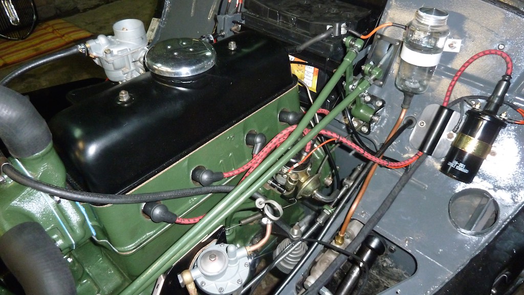 Starting to build up the engine with the accessories - got the gas pedal working perfectly but I need to get another choke cable as mine seems to have bent along the way and is not running smooth. Managed to connect up the starter cable and tried it for fun - first time the engine has turned over on its own since 1972