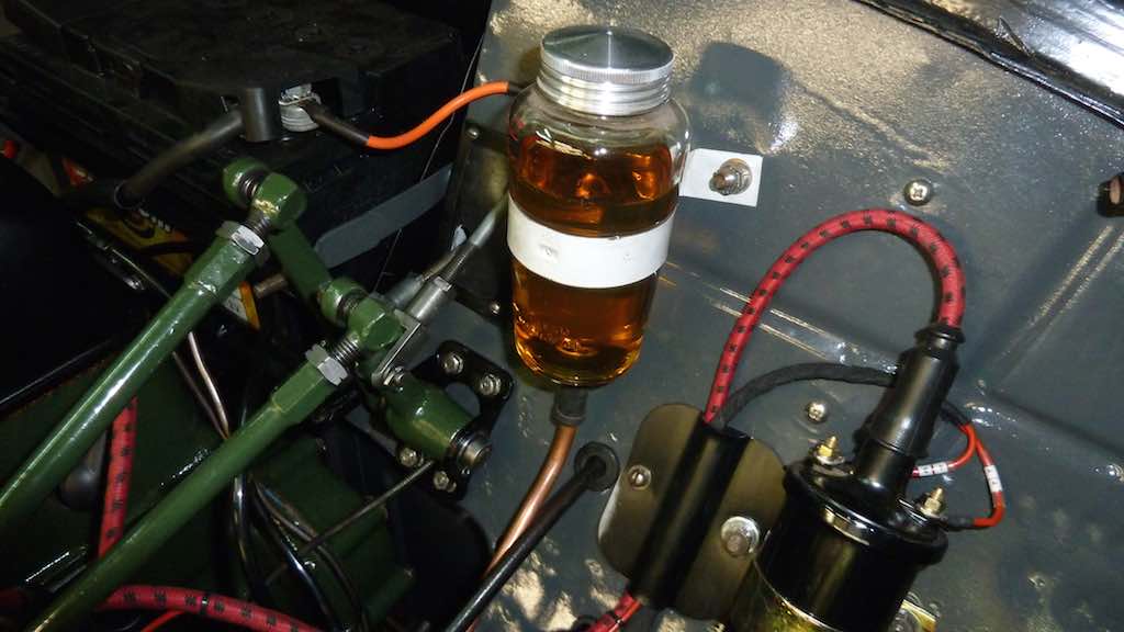 Then onto the brakes. Rear left drum had stuck on and it took an age to remove it. The forward shoe had stuck, must have been when I was fitting the handbrake mechanism. Re centred the shoes and rebuilt the hub. Then onto filling and bleeding - all went OK with a few leaks but it made me go through the whole system tightening and checking. Brakes were sold and worked great (no road test yet though  ) Filled up the glass jar which is the first time it has had fluid in it. Attachment: