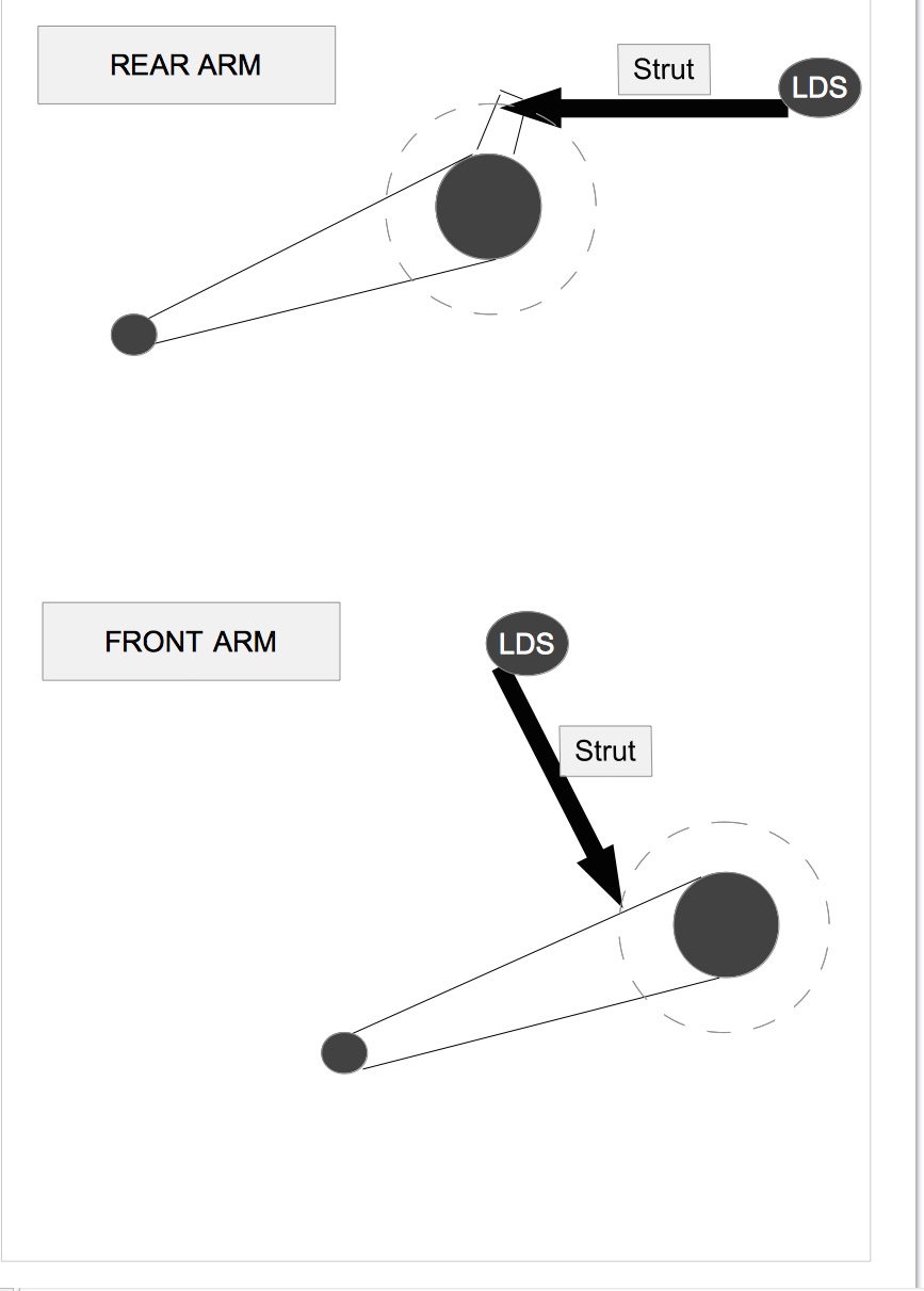 As the arm moves the strut (bottom mount point) radius stays the same, only the angle of the strut alters.