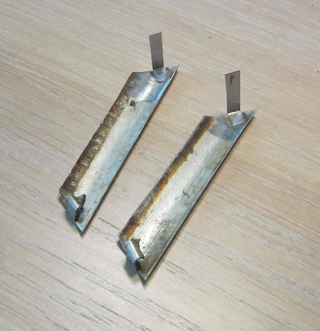 The dent is flattend but the bonnet seems to be tordated. One side scratches on the wing the other side i can put an hand between.... Here the repaired chevron halves, with new lugs glued on with 2K.