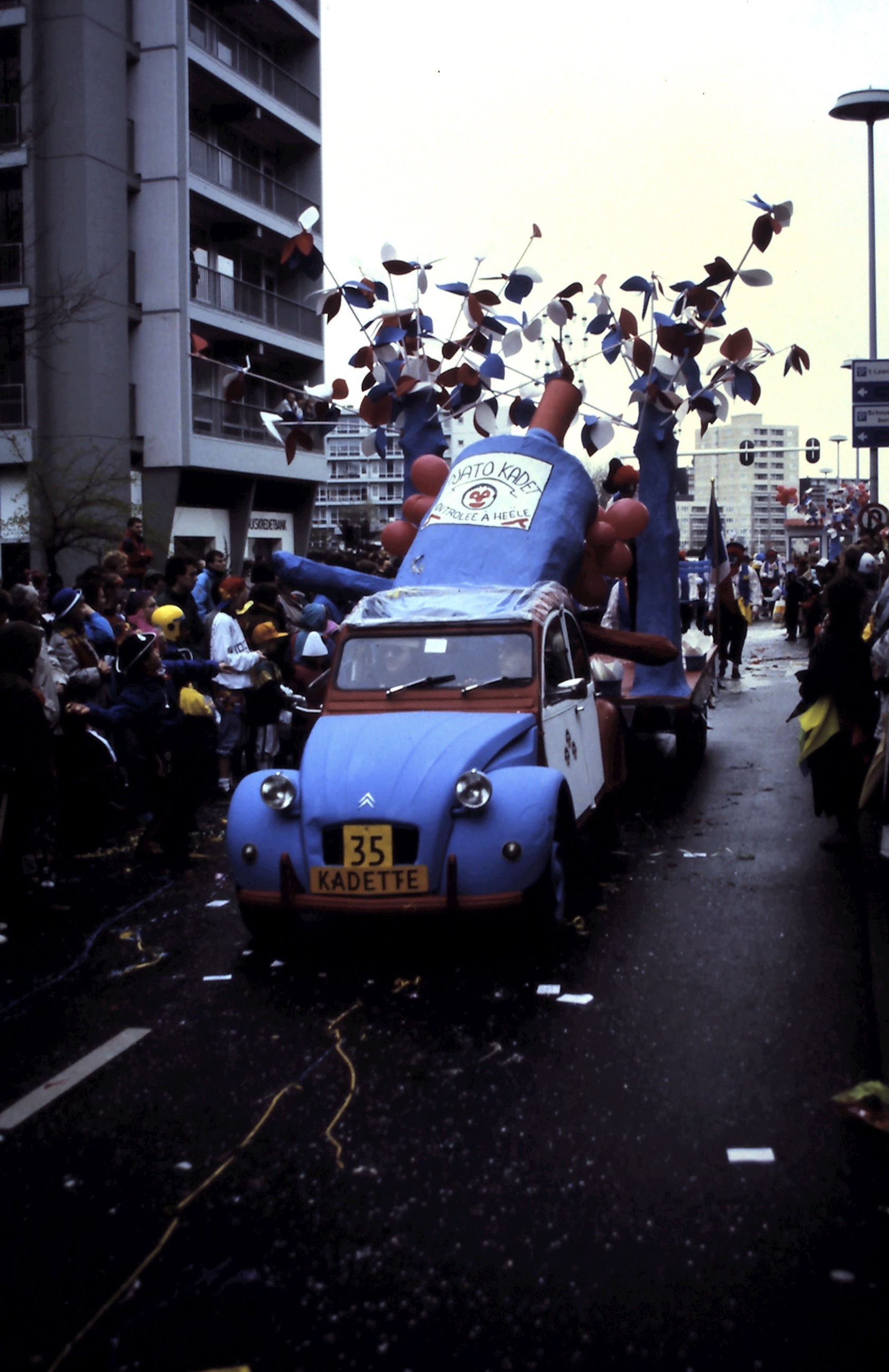 This pictures turned up yesterday. My old 2cv4 in a carnaval parade years ago. Theme France. It's towing a big double axle trailer. Me and Geo in the car the rest of the 20 man group walking. A while, at some stage the were all seated on the trailer. The car pulled it easy.