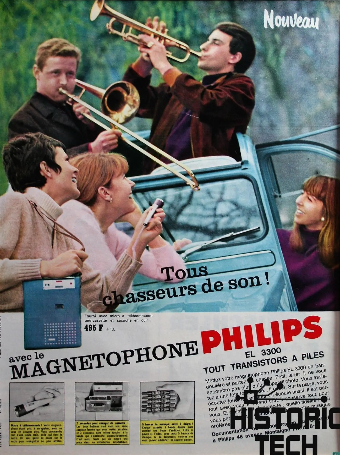 2cv in the ad for the first philips casette recorder 1963 With original suicide doors..