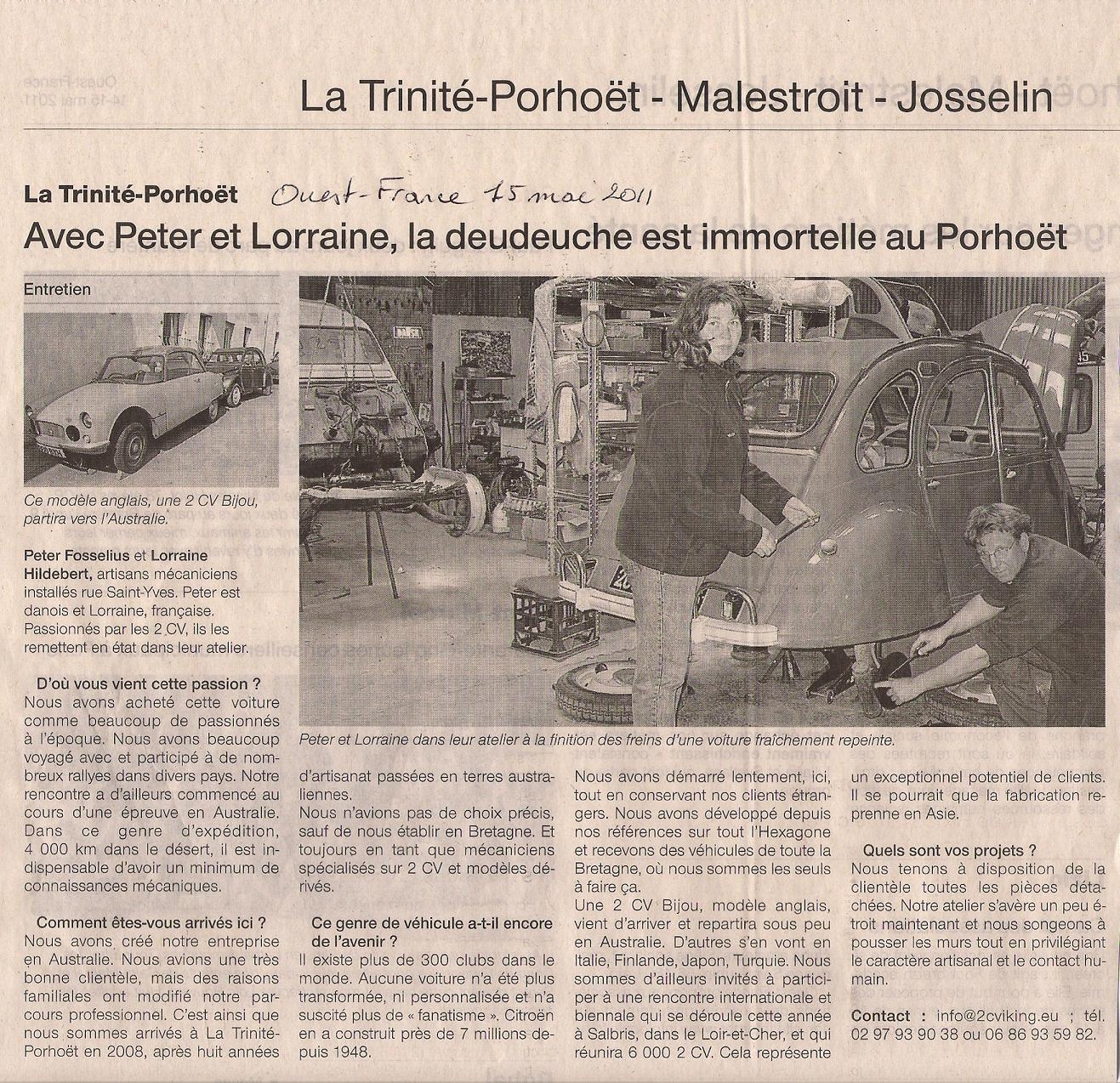 We are world famous in La Trinité Porhoët (again). It seams that the French are fascinated with stories from the past, I guess sheer nostalgia, in this case that a 2CV Garage has opened servicing and repairing 2cv’s only. Our region (Bretagne) is considered a bit remote in many French peoples mind even not very French either. Anyway it is good for us to see some free publicity in the regional newspaper.
