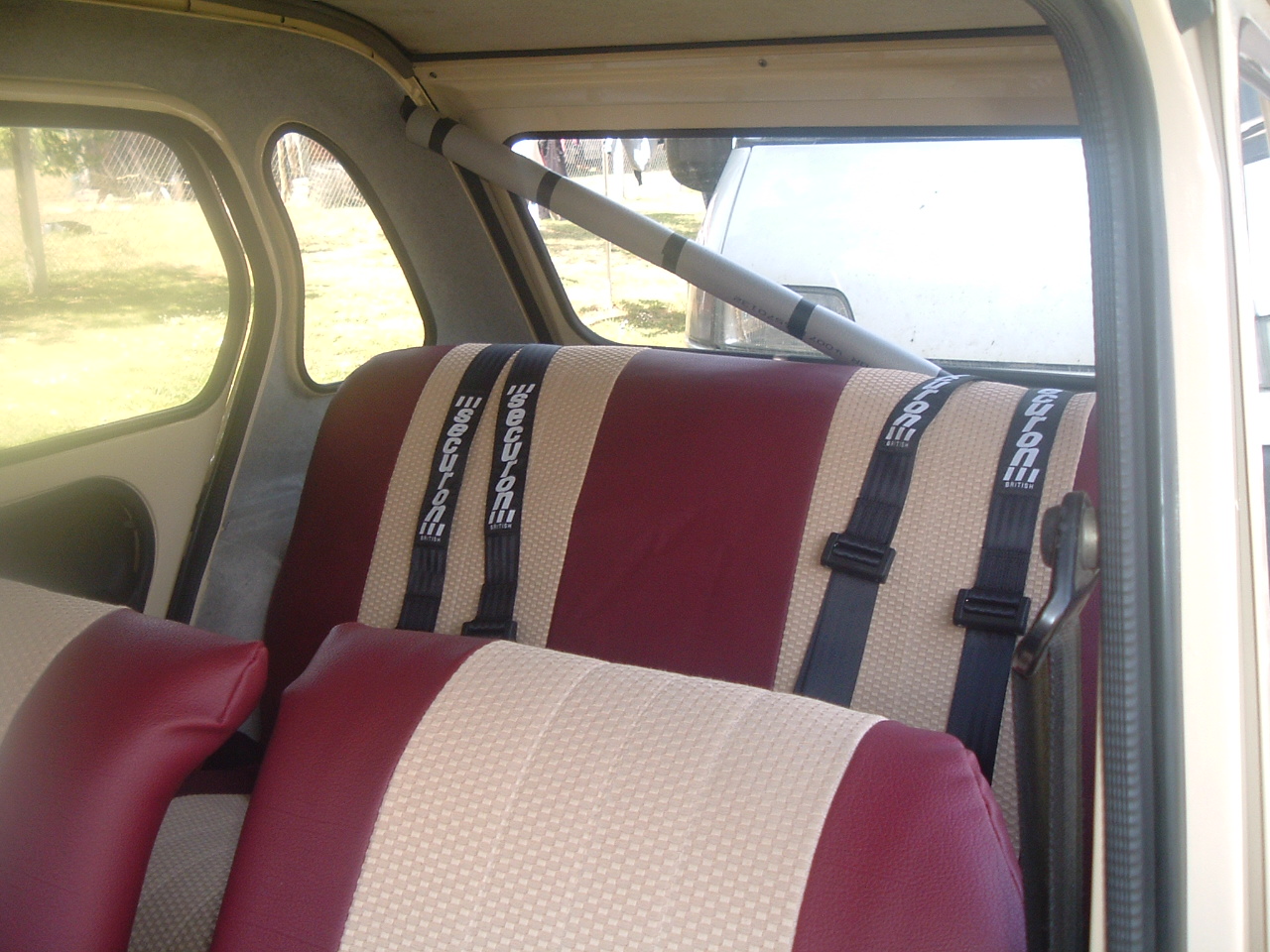 I mounted 2 rally type harness in the Dyane (the kids love them) I made a strengthen piece for the middle strap and mounted it to the inner wheel arch - right at the back